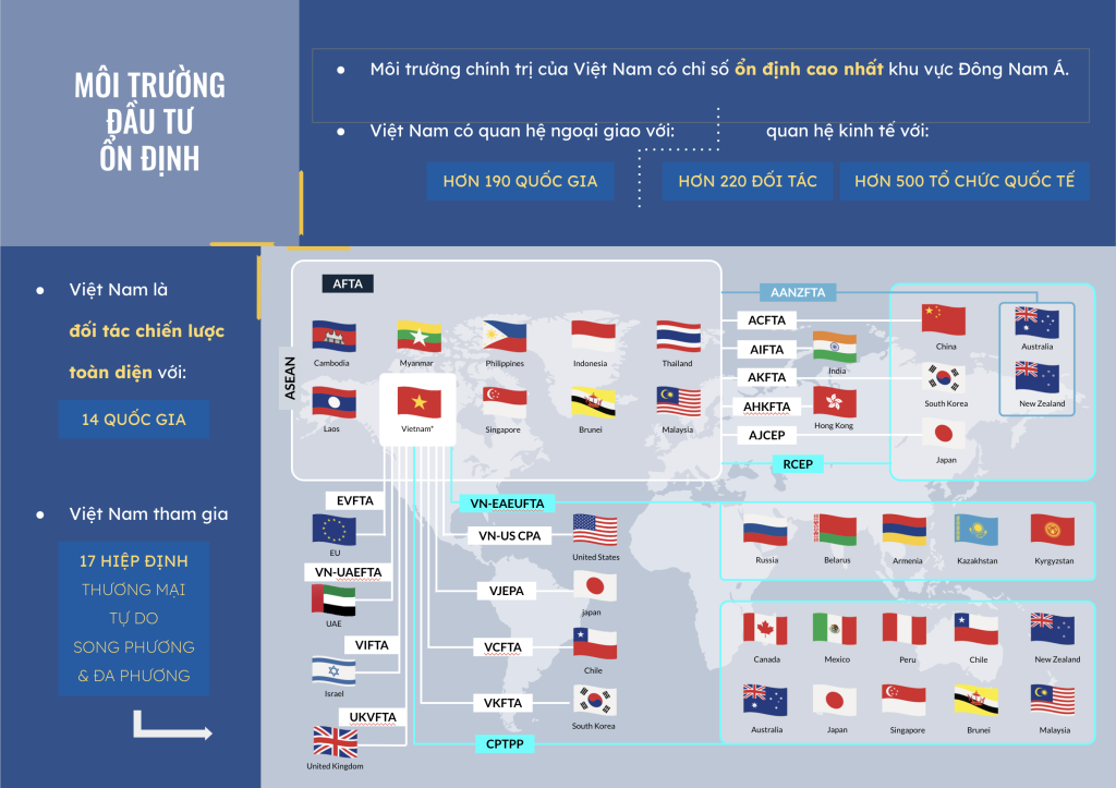Môi trường chính trị của Việt Nam có chỉ số ổn định cao nhất khu vực Đông Nam Á, cùng với đó, chính sách và định hướng phát triển kinh tế nhất quán của Việt Nam tạo nên sự yên tâm cho các đối tác, các nhà đầu tư.